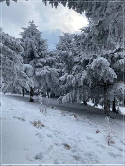 산길을 따라 눈이 쌓이면 눈꽃 터널이 형성되어 환상적인 분위기를 자아냅니다.